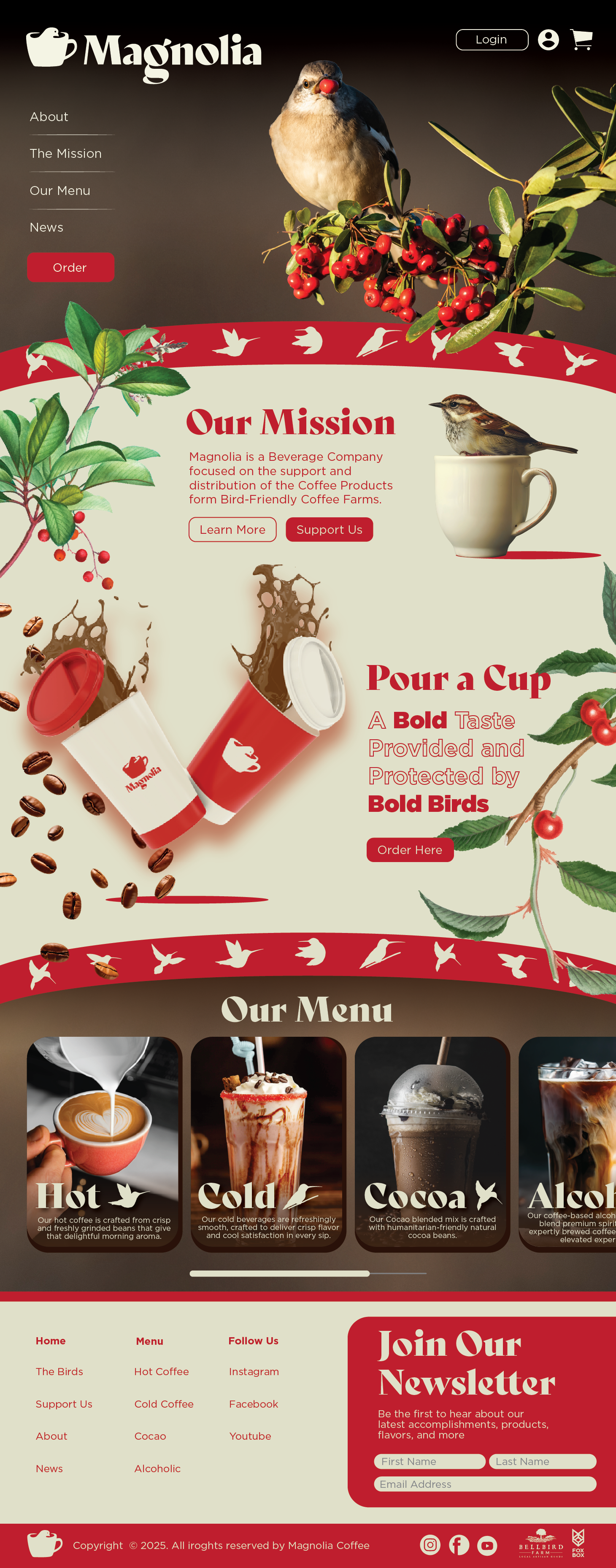 Magnolia is a Coffee provider that receives its products exclusively from bird-friendly coffee farms. With a strong branding meant to stand out from its competitors, Magnolia utilizes red and cream to grab customer's attention while presenting a strong branding effort.