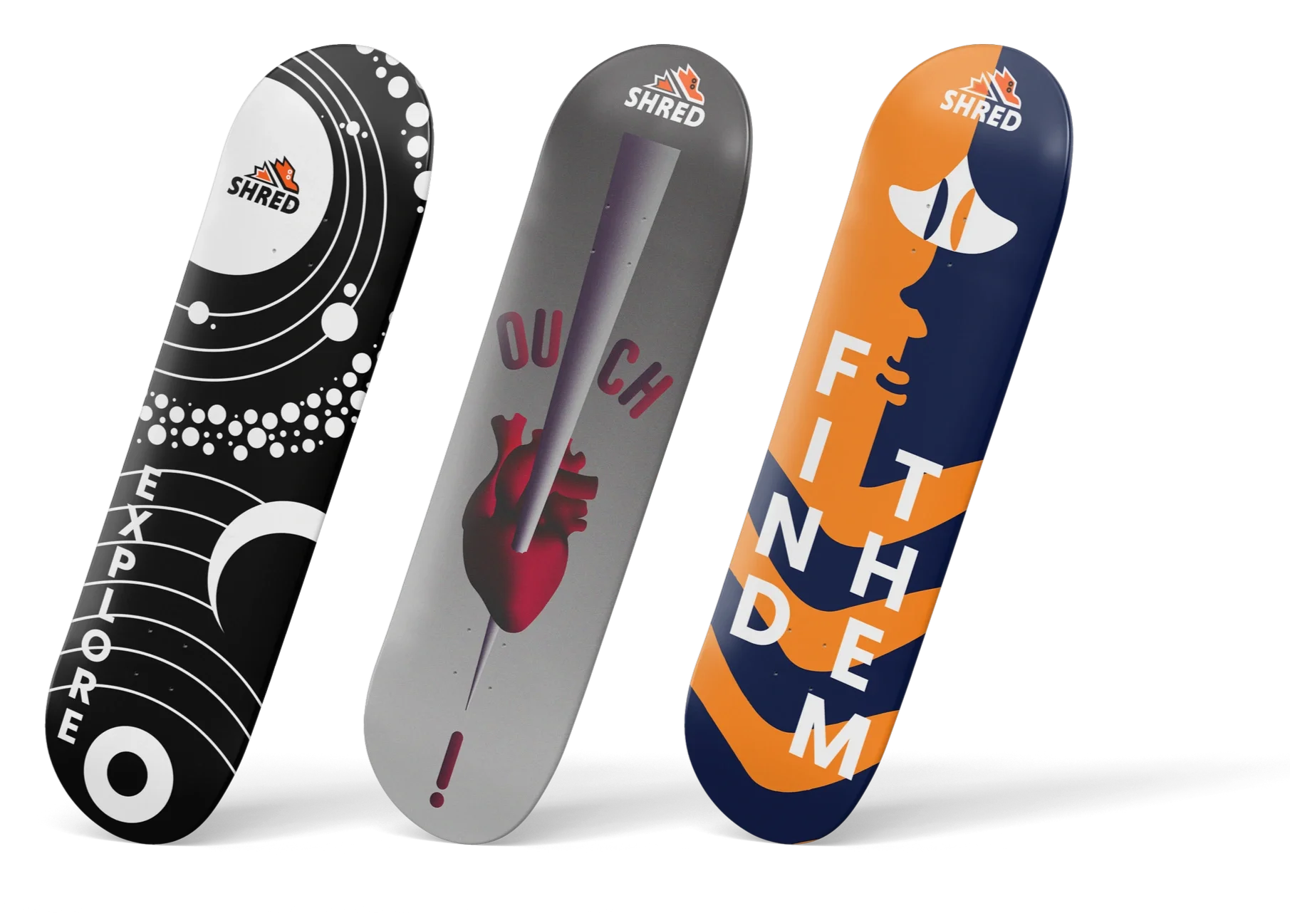 Shred is a skateboard deck designing company meant to bring some of the most romantic, simple, and rockstar designs to the skateboard world. Taking inspiration from organic elements, with a simplified undertone, Shred makes some of the most extravagant board designs in the market.